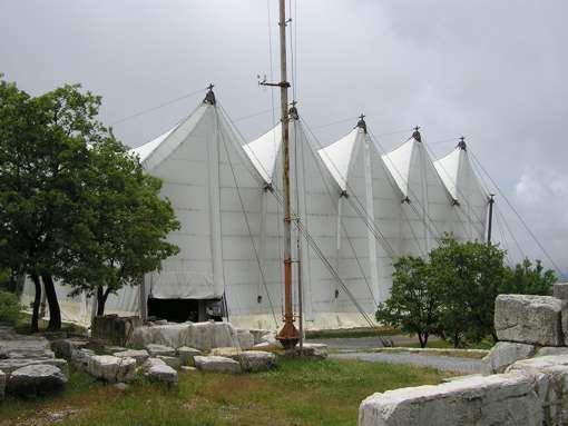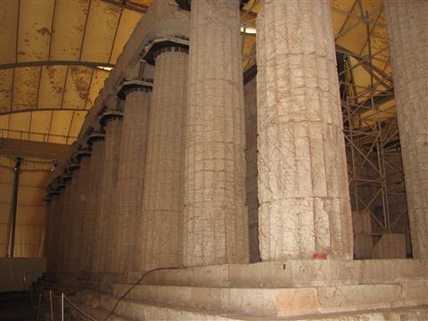 18.05. Auf einer abenteuerlichen Fahrt über Andritsena erreichten wir Vasses (Bassä), in 1.130 m Seehöhe, ein Säulenhallentempel, der Apoll dem Helfer geweiht war. Heute gehört er zu den großartigsten Denkmälern griechischer Tempelarchitektur. Um diesen Tempel zu erhalten und zu restaurieren, ist er mit einem riesigen Zelt gegen Umwelteinflüsse geschützt. | |